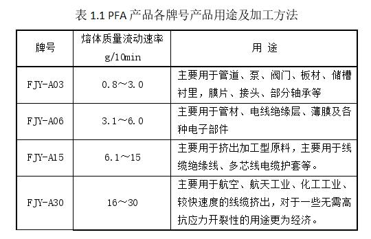 不同的是pfa熔點在290~312℃,熔指在0.8-30g/10min范圍內,成型溫度在350~410℃之間,pfa樹脂用模壓成型、擠出成型、注射成型等加工工藝,各牌號及產品用途如下表
